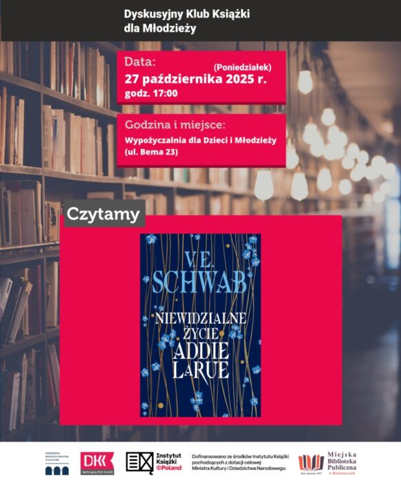 Wypożyczalnia dla Dzieci i Młodzieży zaprasza 27 października 2025 r. o godz. 17:00 na spotkanie Młodzieżowego Dyskusyjnego Klubu Książki „Tu czytamy”.