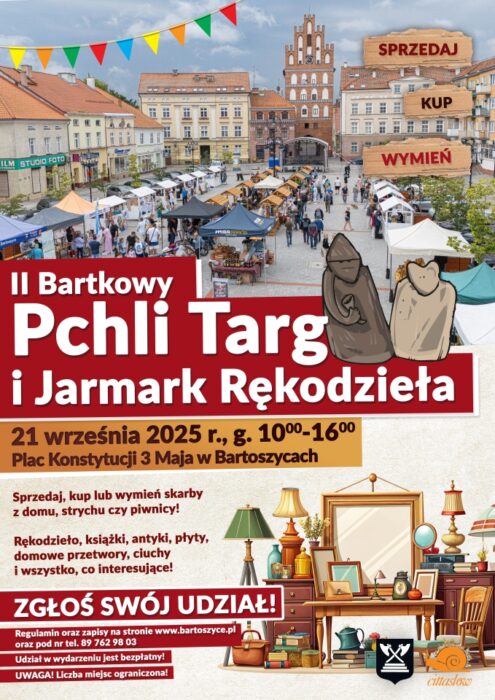 Zapisy na II Bartkowy Pchli Targ i Jarmark Rękodzieła możliwe są poprzez wypełnienie online formularza: https://umbartoszyce.formularze.org/e-form/1723.html
